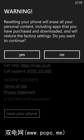如果您的手机装有可拆卸电池,则可以尝试在随机重启Windows Phone之后尝试卸下并更换电池,但是如果没有,无法工作或无法恢复出厂设置可能是您的最佳选择。请注意,这将意味着您的个人数据,应用程序和设置丢失,因此您将需要采取步骤进行备份。