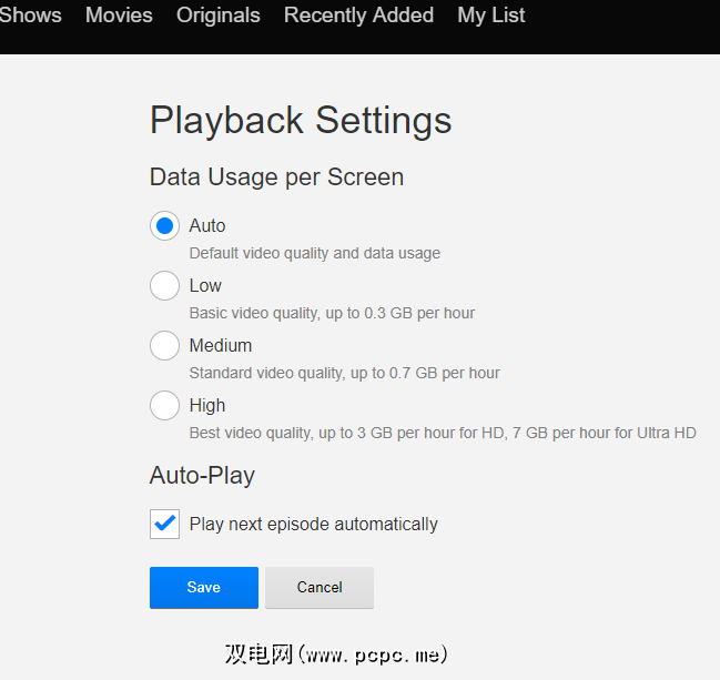 只需取消选中自动播放下一集的复选框即可。当我们在这里时,上面的每个屏幕的数据使用情况部分对于管理数据使用情况也很有用。每个可能的设置都会告诉您每小时使用的最大数据量。调整自动播放设置后,单击蓝色的保存按钮以确认更改。