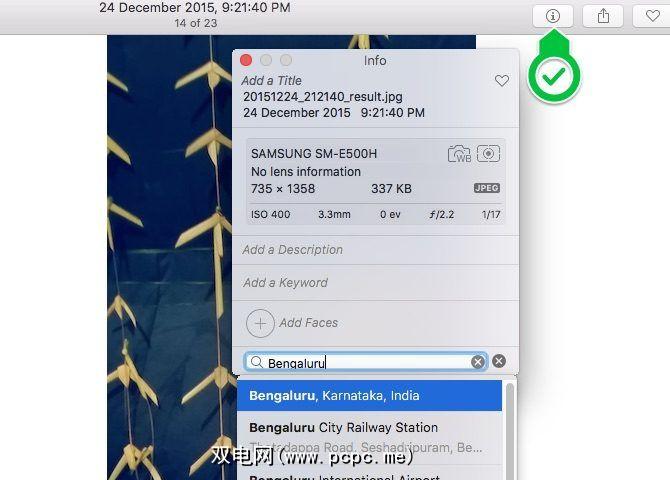 并非所有照片都会自动获取位置信息。对于某些用户,您必须自己添加它。为此,请先打开照片,然后单击顶部的主工具栏中的 i 图标。