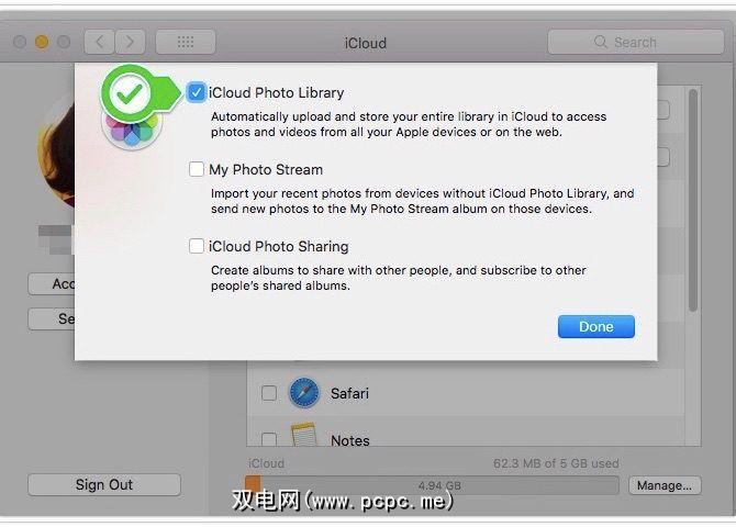 如果您想为照片库使用云同步功能,请转到系统偏好设置> iCloud 。在此处,点击照片旁边的选项按钮。现在,在显示的框中,选中 iCloud照片库的复选框,然后点击 Done (完成)按钮。