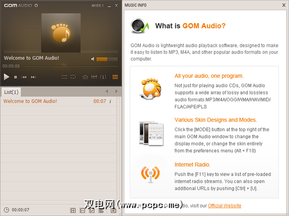 安装了GOM Audio后,这是一个受欢迎的界面,您会看到:左侧的主要播放器,右侧的介绍面板。如果您仍然想知道GOM Audio的确切功能,它会告诉您:轻巧的音频播放器,旨在让您轻松在计算机上听音乐。我可以对其进行挖掘。
