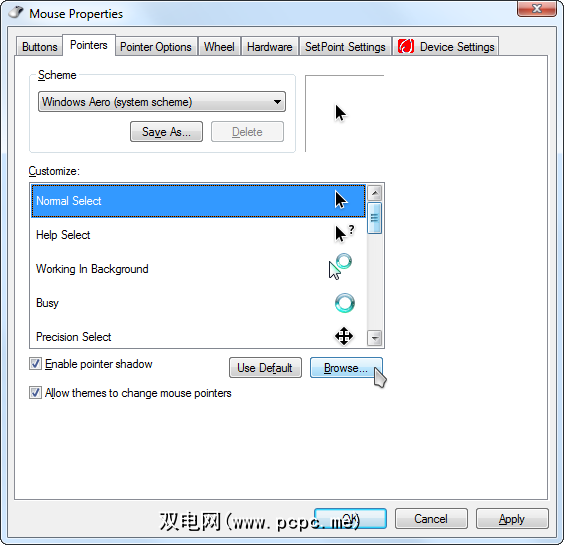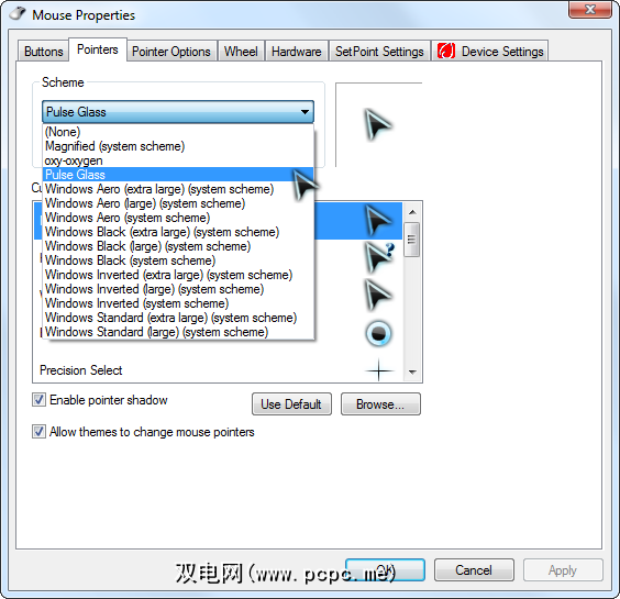 单击“方案"下拉框,然后选择已安装的光标集–安装的所有鼠标指针方案都将是在此框中列出。单击“应用"按钮以激活新的光标集。