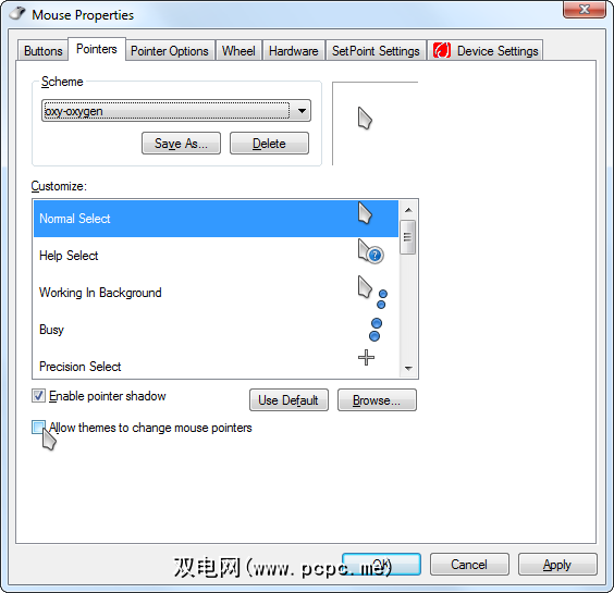 默认情况下,鼠标指针链接到Windows主题。如果在“个性化设置"控制面板中更改为新主题,则会丢失自定义光标方案。为了防止这种情况的发生,请在“鼠标属性"窗口中取消选中允许主题更改鼠标指针复选框。