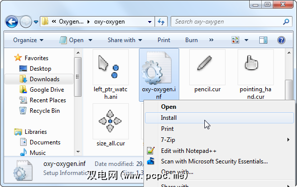 提取下载的光标主题后,您通常会看到一个。 inf文件放在其文件夹中。右键单击.inf文件,然后选择“安装"以在计算机上安装光标方案。 (如果该方案未随附.inf文件,请参见下面的说明以获取相关说明。)