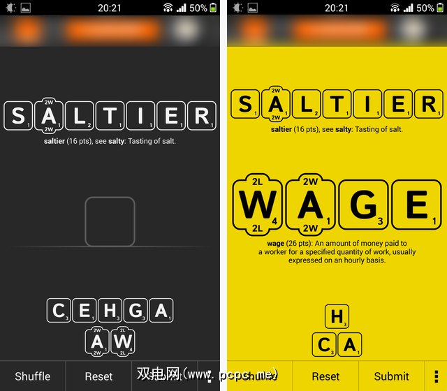 这就是游戏的样子:您得到了一堆字母,并且需要与它们组成两个单词才能获得最高分。一些细微的接触使作弊变得困难:一方面,给定字母不一定总值相同的点数。如果您仔细查看上面的屏幕截图,您可能会发现S a ltier和W a ge中的字母A带有“双字"奖励– a很小的2W标记-但是仍在字母库(位于屏幕底部)中的字母A没有这种奖励。因此,您也许可以将所有这些字母输入到Scrabble-cheating网站中,但获得的结果并不一定会为您提供Wordiest中最高的分数。