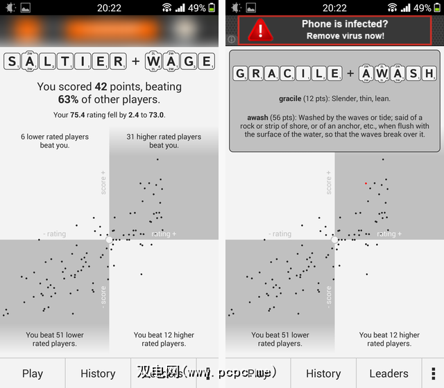 另一个散点图的一个很酷的功能是每个数据点都是交互式的:如果您想知道另一个玩家如何能够获得如此高的分数,只需按住该数据点,游戏就会显示该玩家组成的单词及其定义。游戏还会保存您的历史记录,以便您浏览过去的游戏,并为您分配随时间推移而更新的玩家排名。您可以使用Google Play游戏登录,将所有这些同步到云上。