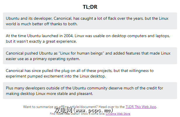 作为TLDR如何在文化中建立的代表,您可以会找到几个TLDR浏览器扩展。这些使您可以获得在线阅读的任何页面的摘要版本。其中一些已过时,并且没有一个受到广泛欢迎,但是如果您喜欢汇总,则值得一看。