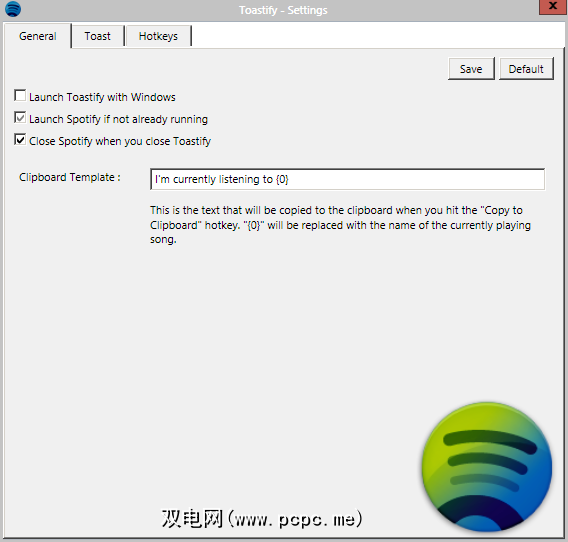 上面的屏幕快照中的两个被选中的选项基本上使Toastify可以充当完整的Spotify管理器。启动后,Spotify将启动;关闭时,Spotify将关闭。还有一个更晦涩的功能,允许您将当前播放的曲目存储在Windows剪贴板上。