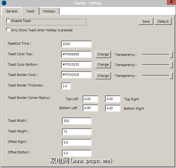 如果不感兴趣,或者如果您使用的是类似Last.fm的应用程序,该应用程序在被激活时会模仿这种行为,则可以完全禁用烤面包。您还可以将它们设置为仅在按下Toastify热键时弹出。此处的其余设置完全美观,可以更改颜色,透明度,边框和吐司尺寸。