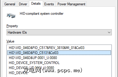 随即打开“属性"窗口,切换到详细信息标签。使用属性下拉菜单,选择硬件ID 。您感兴趣的值将采用以下格式: