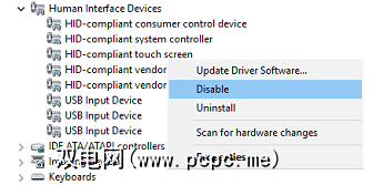 双击人机界面设备标题以展开其中的设备列表。从此处,在符合HID的触摸屏上右键单击,然后选择 Disable (禁用)。