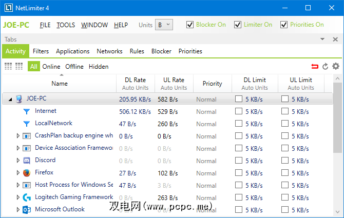 启动NetLimiter时,您会看到所有打开的应用程序的列表,以及它们当前的带宽使用情况。当然,某些应用程序自然会比其他应用程序使用更多的带宽,但是很容易识别消耗更多资源的应用程序。