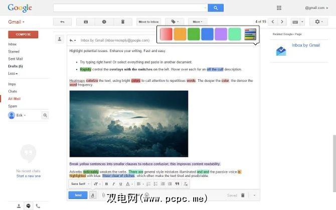 DraftMap使用不同的颜色来突出显示不同的样式建议。它将指出重复的单词,被动语态,副词和陈词滥调,甚至为您提供电子邮件的可读性和样式方面的建议。这些原则与欧内斯特·海明威(Ernest Hemingway)的写作规则相同。该扩展程序可直接从您的Gmail撰写窗口中完成所有这些操作。