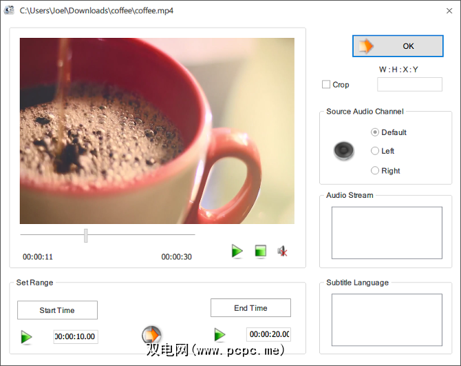 要拆分视频,请使用 + Video 按钮加载视频,然后单击以进行编辑。使用播放时间线以及开始选择和选择结束按钮(在“剪切"部分下)选择一个时间范围。完成后,单击确定,然后单击底部的输出按钮之一以导出。