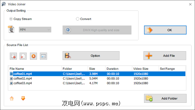 要合并视频,请转到边栏中的实用程序>视频合并器。设置适当的输出设置,然后单击添加文件以加载所有单个剪辑。最后,在正确订购所有内容后,单击确定,然后单击开始开始合并任务。