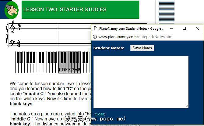 一个在线学习钢琴的最佳站点是PianoNanny。这是罕有的网站之一,可免费提供最详细,专业的钢琴课。只需阅读完这些课程,您就会感觉自己正坐在真正了解钢琴知识的实际钢琴老师旁边。每个会话都包括文本,键盘图像以帮助您直观地了解老师在说什么,甚至包括微型应用程序,例如“学生记事本"来做笔记。