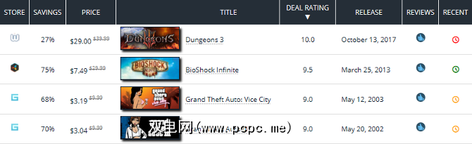CheapShark的交易列表页面上有一个有趣的排序措施,称为< strong>交易评分。它会考虑各种因素(例如,绝对价格,折价百分比,Metascore,发布日期)来确定交易的效果。一目了然!