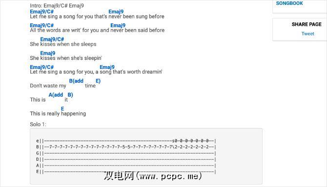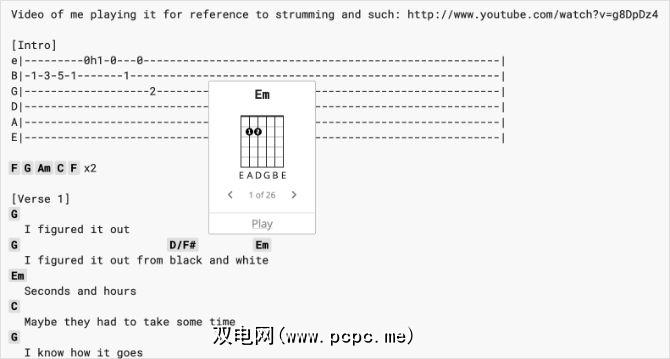 单击所需的版本时,应该会看到吉他和弦,标签和歌词的组合。有时还会有关于如何播放歌曲的说明。在我们选择的“您和我"版本中,也有指向YouTube上的演出的链接。