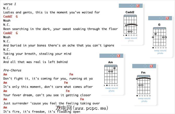和弦出现在歌词上方。如果需要,可以播放Apple Music或Spotify中的歌曲,以了解其声音。