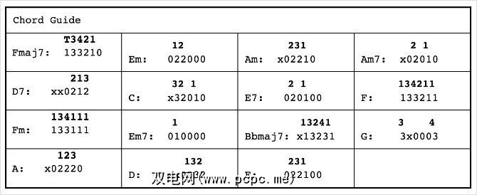 和弦图随即打开,其中包含有关您需要使用的和弦以及弹奏弹奏模式的信息。花点时间熟悉一下,然后向下滚动才能看到吉他的和弦和歌词。