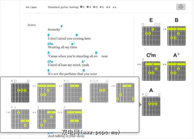 将鼠标悬停在每个和弦名称上,可以看到显示该如何播放的图表。您可以听到声音,甚至可以使用箭头按钮查看其他指法。如果您想唱歌,可以将歌曲移到适合您的琴键上。