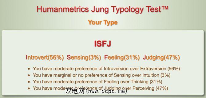完成并获得结果后,您会看到自己的性格类型由四个字母标记,每个字母都有一个百分比。然后,您可以获取有关类型的更多详细信息,其中包括功能分析。