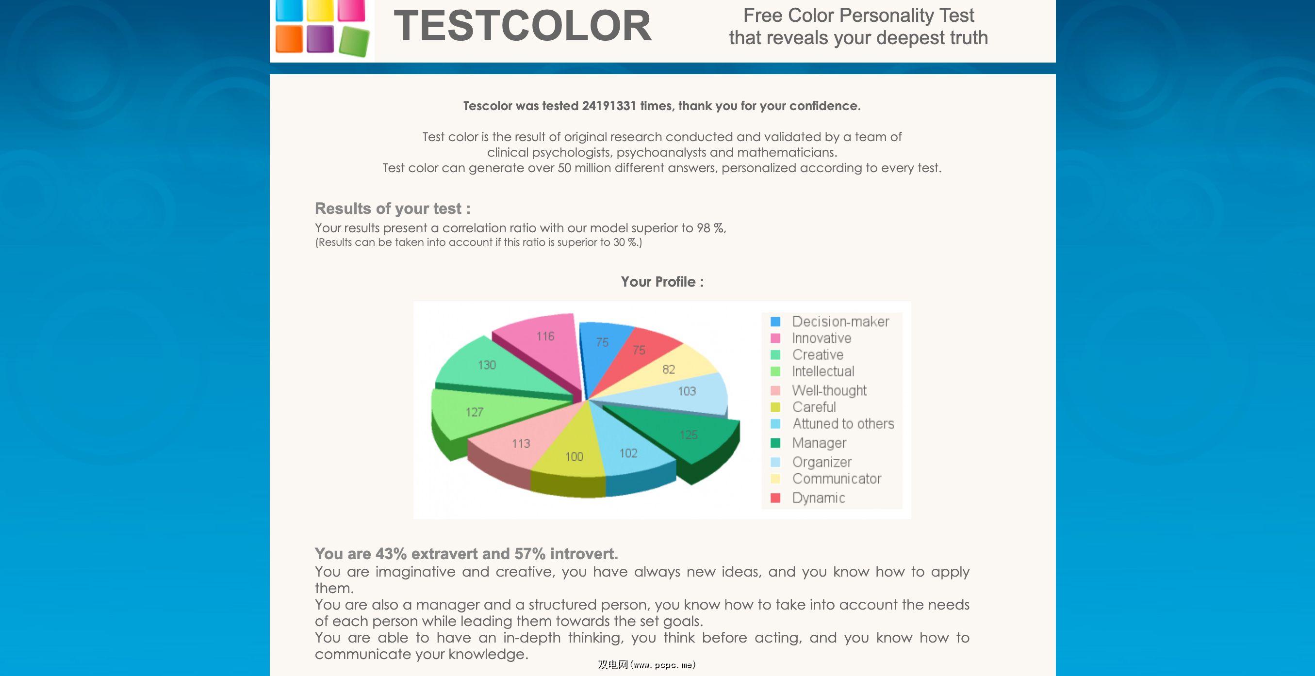 TestColor还提供了一项爱情测试,并为您的未来做准备。您还可以查看高级人格测验,该测验为您提供有关您的性格的20多个专业报告。