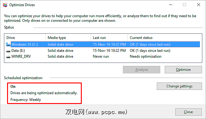 Windows内置的磁盘碎片整理/优化驱动器工具是大多数人所需的工具。碎片整理。只需单击分析以找出驱动器的碎片程度,然后单击碎片整理/优化即可开始该过程。现代版本的Windows会自动按计划执行此过程,因此您无需手动运行此实用程序。