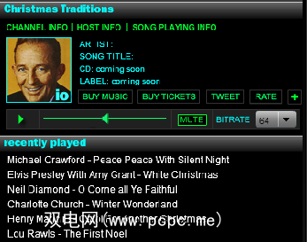 该播放器简单易用。您可以选择一个比特率(64或32),查看正在播放的歌曲,最近播放的其他歌曲,然后通过左侧菜单(以下未显示)快速切换到另一个假日频道。