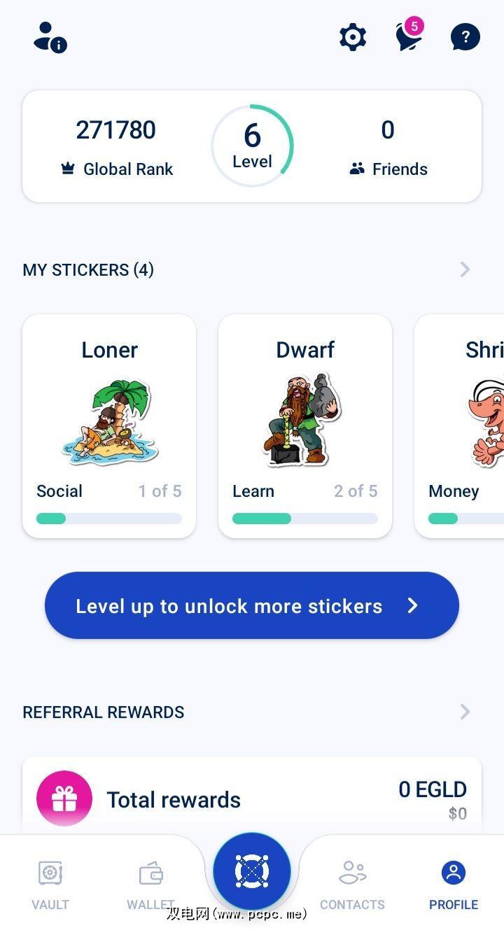 But that's not all the Maiar app offers. You can also reach different levels on the app for performing various tasks. These include inviting friends to the app, the number of learning stickers you earn, or the amount of eGold you own. eGold (also known as EGLD) is a crypto coin you can buy or earn via staking. And yes, the Maiar app also lets you stake!