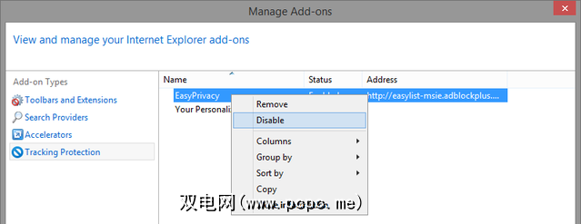 Internet Explorer的跟踪保护功能可以减少对您隐私的网站跟踪,它也可以干扰内容。要关闭跟踪保护,请从工具菜单中选择管理加载项。从左侧栏中选择跟踪保护,然后右键单击列表中的每个项目,然后选择禁用。