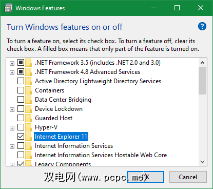 要再次激活Internet Explorer,请在“开始"菜单中键入 Windows功能,然后选择打开Windows功能或关闭。在显示的列表中,向下滚动并检查 Internet Explorer 11 (如果尚未安装)。单击确定,等待该过程完成,然后重新启动PC。这样便可以使用它。