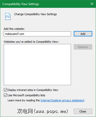 在另一方面,如果该网站看起来不正确并且在“兼容性视图"列表中,请单击它,然后选择删除。除非网站是专门为IE 8或更旧版本而建立的,这种情况现在很少见,否则您永远不需要使用兼容性视图。