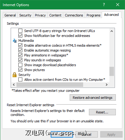 如果全部失败,请按照上述说明将IE重置为其默认设置。