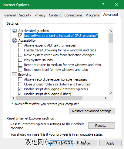 要更改此设置,请单击顶部的齿轮图标-Internet Explorer(代表工具菜单)-右,然后是 Internet选项。选择顶部的高级标签,然后选中使用软件渲染而不是GPU渲染的复选框。点击确定,然后您需要重新启动PC才能使更改生效。