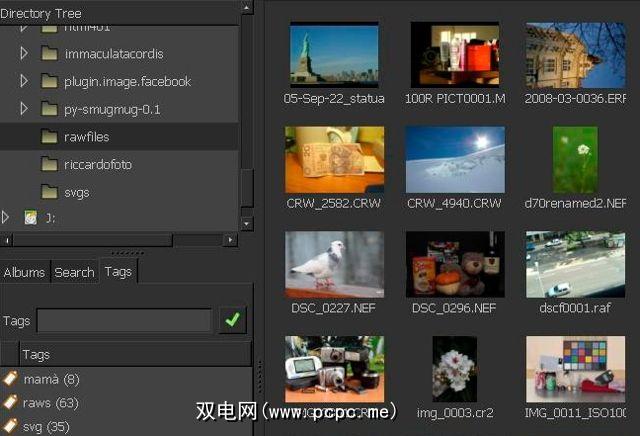 GTKRawGallery具有一个相当传统的文件浏览器,照片以缩略图显示,菜单栏顶部带有图标。您可以更改布局并在深色和浅色主题之间切换。有一个侧边栏可显示您的相册,标签,搜索结果,并允许您以树状视图浏览计算机上的所有文件夹。