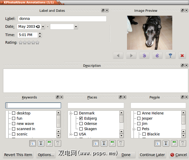 每张照片都可以属于多个类别,并可以根据需要添加任意数量的标签。如果单击缩略图视图底部的时间线/直方图栏,则可以按日期对照片进行排序。 年龄查看选项可让您添加有关人的年龄的信息,并根据此标准对照片进行排序,这对父母来说可能特别有趣。与digiKam一样,KPhotoAlbum也支持人脸识别,并且可以通过KIPI插件进行扩展。