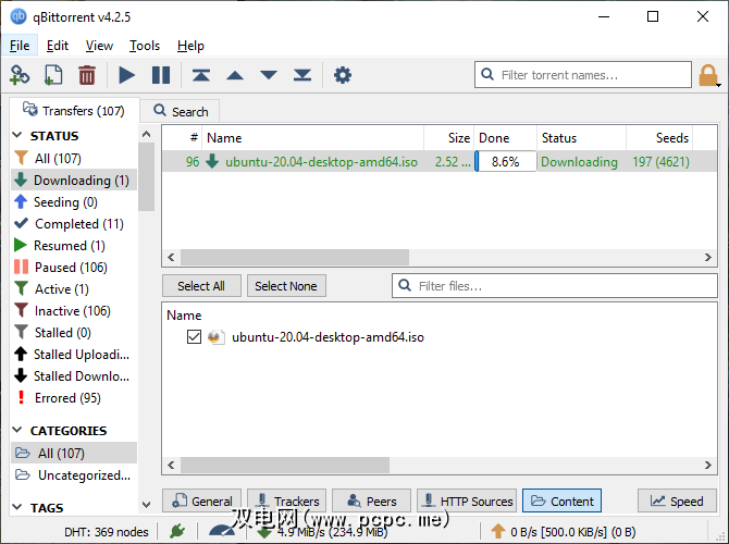 现在,选择内容标签。该选项卡显示了当前正在下载的选定种子文件的文件列表。 Ubuntu Desktop torrent文件包含一个文件,您可以在“内容"选项卡中看到该文件。如果您下载了链接到多个文件或文件夹的torrent文件,则可以从此选项卡进行管理。