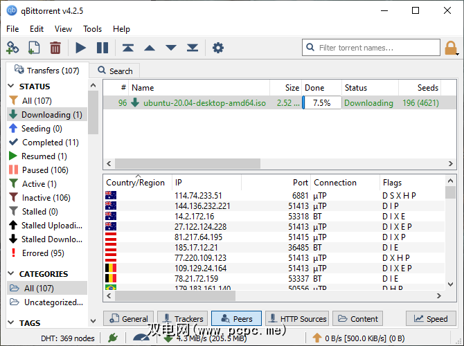 选择对等标签。在这里,您可以看到您的BitTorrent客户端当前正在连接的每个用户的列表,可以下载文件,上传文件,也可以根据您的客户端设置来准备其中的任何一项操作。