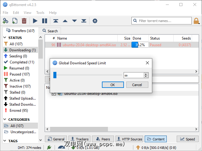 最后,在标签下方,您会看到两个小方框。一个带有绿色箭头,指示下载速度,另一个带有橙色箭头,指示上传速度。如果您希望限制客户端的下载或上传速度,则可以在此处更改选项。请记住,这些速度适用于整个BitTorrent客户端,而不仅是单个洪流文件。