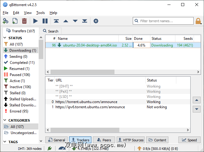 Ubuntu Desktop torrent文件将加载到qBittorent中并开始自动下载。在qBittorent窗口的底部,您将看到标记为常规,跟踪器,对等体,HTTP源和内容的标签。