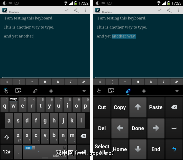 正确,您会看到一种模式,专门用于解决Android上文本输入的一个更烦人的方面:四处走动。是的,您可以点击屏幕并拖动,但这是相当糟糕的用户体验。 TouchPal X提供了一个宽敞的编辑板,即使最胖的拇指也能感到舒适。您可以四处移动光标,触发文本选择并执行常见的编辑操作(如果您将两个单词融合在一起,甚至可以输入空格)。
