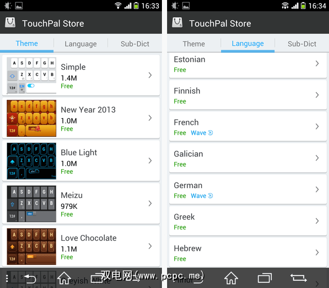 TouchPal X带有一个内置商店,就像我们在2011年回顾的Go Launcher中使用的商店一样。该商店具有许多主题和语言。在右侧,您可以看到某些语言具有“波形"功能-“按键上出现的单词"的正式名称。不支持Wave的语言仍然可以滑动,这确实很重要。