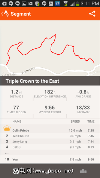 尽管Strava非常适合分析自己的表现,但它擅长于社交平台,您可以将自己的表现与其他运动员进行比较,以争夺细分市场中的头把交椅,这些细分是道路或小路的特定部分。在查看特定细分受众群(例如以下细分受众群)时,您会看到排名最高的排名以及自己的时间和排名。