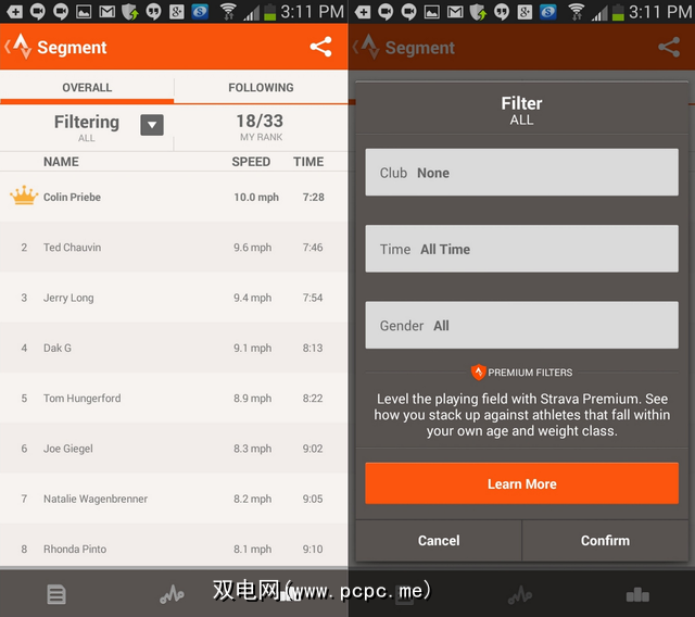 好奇每个人在这方面的表现如何分割?还是只是特定的人?您也可以查看。下面显示的是总体排名,但是通过点击“跟随",您可以了解如何在Strava上与您的队友,朋友和其他同伴堆叠在一起。注意右边的第二张图片–您可以按俱乐部,时间和性别过滤结果。