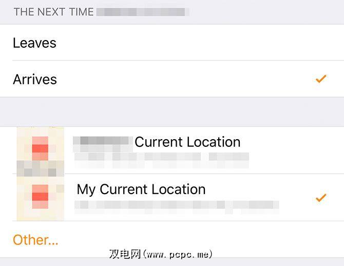 您可以选择在联系人离开当前位置或在另一个位置附近时接收通知,前提是他们已经与您共享位置。