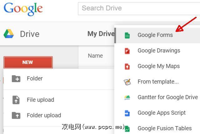 或者在Google云端硬盘中,只需单击“新建",然后在菜单中找到Google表单。