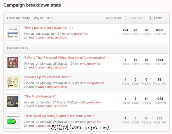 向下滚动以查看每个单独进行广告活动。您可以按时间顺序或点击次数对该列表进行排序。在这里您可以轻松查看每个广告系列的效果,达到了多少人,并将其与图钉的日期和时间等相关联。