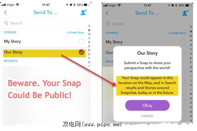 当您将快照发布到我们的故事时,即表示您授予Snapchat将该快照包含在其发现功能中的权限,如果他们愿意,还可以将其包含在快照地图中。这意味着潜在的任何人都可以看到该快照(尽管他们看不到您的用户名)。