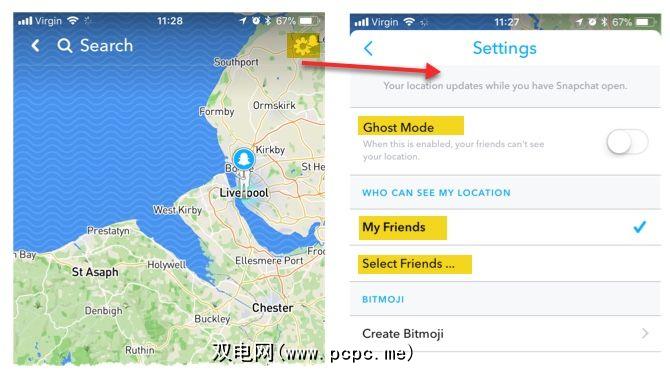 首次使用Snap Map时,系统会要求您选择隐私设置。您还可以通过单击地图右上角的齿轮图标来更改这些设置: